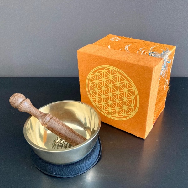 Die kleine Klangschale hat einen hellen und klaren Klang, deshalb eignet sie sich gut zur Meditation. Sie liegt angenehm schwer auf der Hand. Der Schalenboden und der Deckel der hochwertig gearbeiteten Box sind mit dem Symbol der Blume des Lebens verziert.